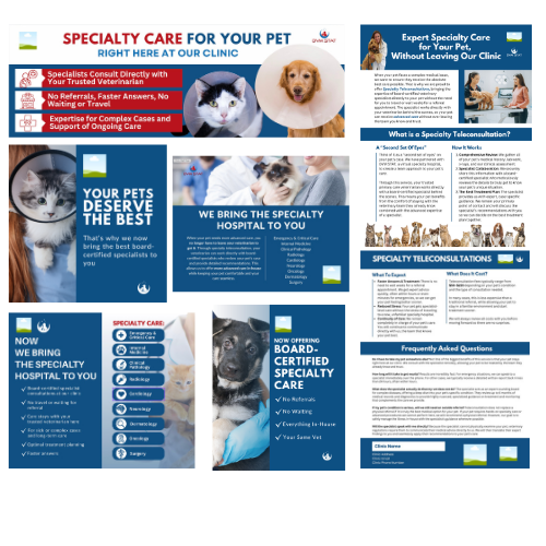 Clinic Flyers: Download and display flyers in your clinic’s lobby or exam rooms to spark organic conversations with pet owners. Templates can be customized with your logo, brand colors, and, if desired, your clinic’s pricing or how you present teleconsultation to clients.